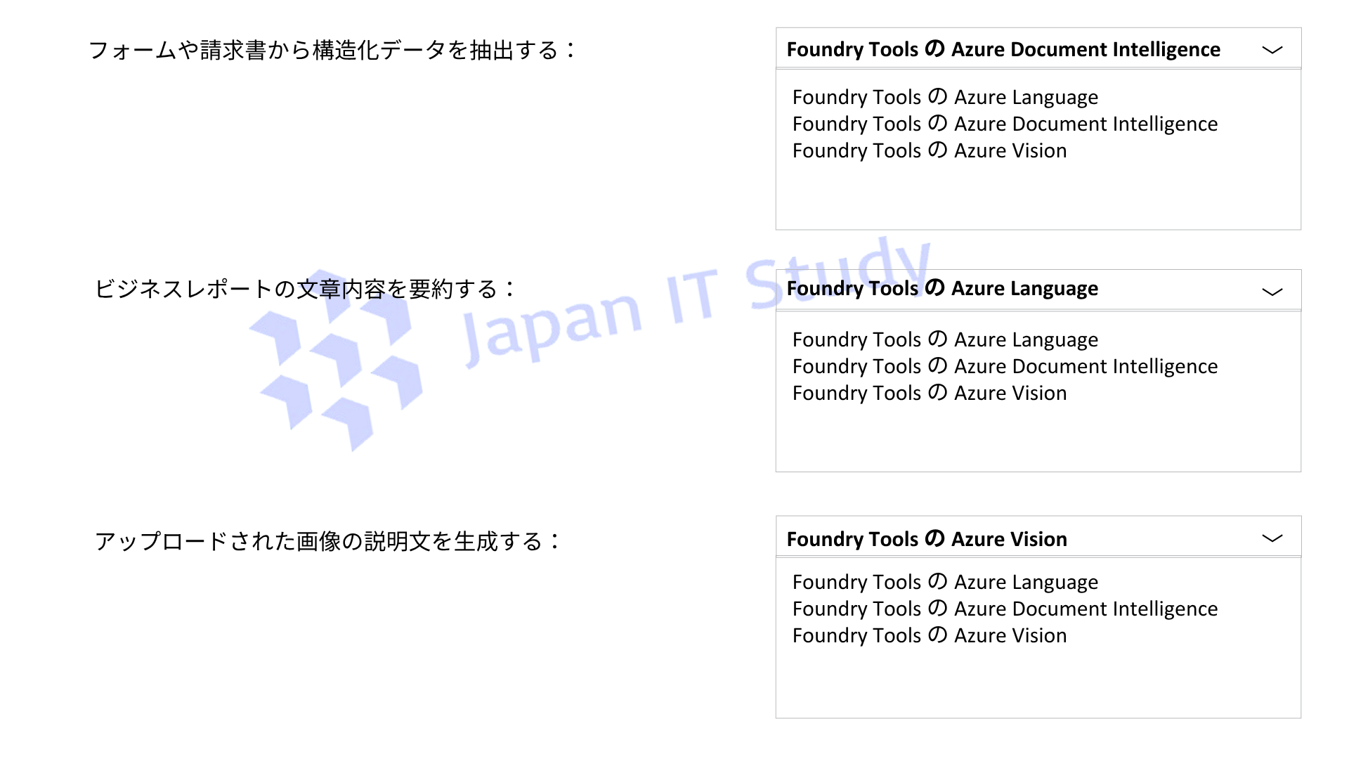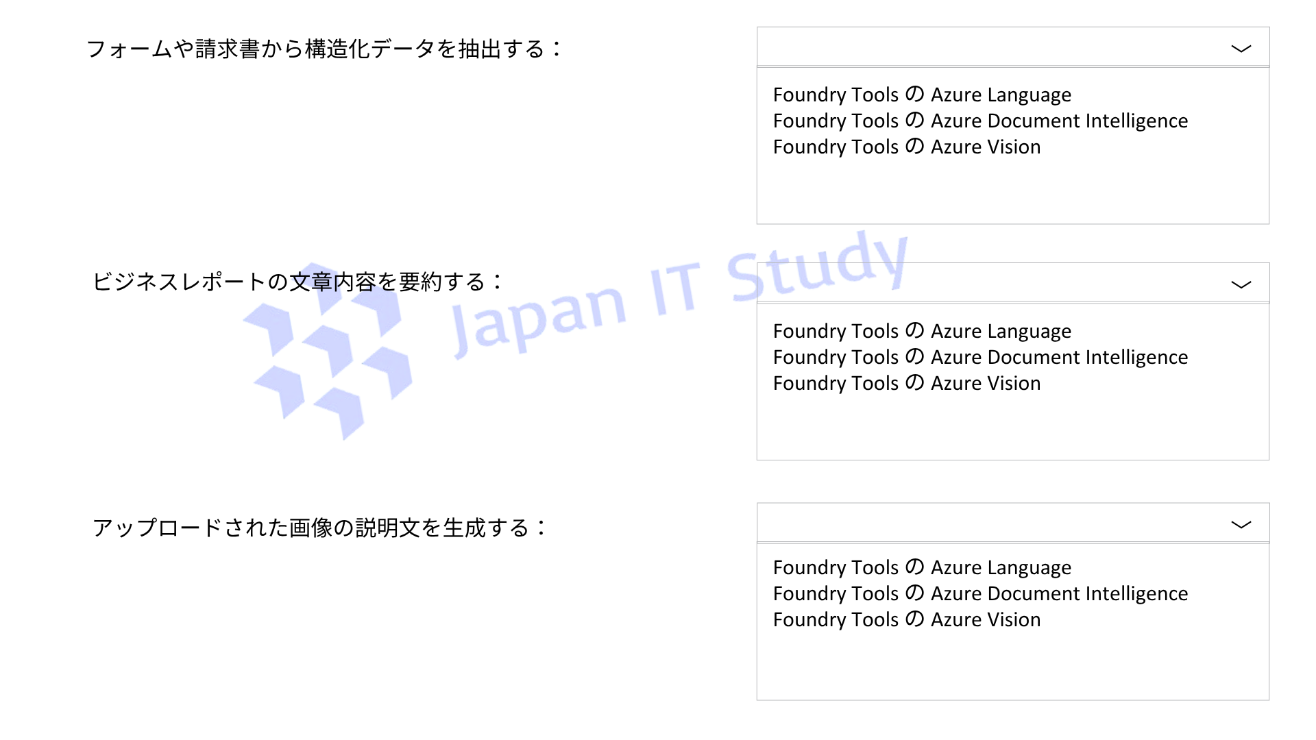 この問題はAzure AIサービスの用途理解が問われています。Azure Document Intelligence(旧称:FormRecognizer)は、フォームや請求書などのドキュメントから構造化データを抽出するためのサービスであり、この用途に最適です。