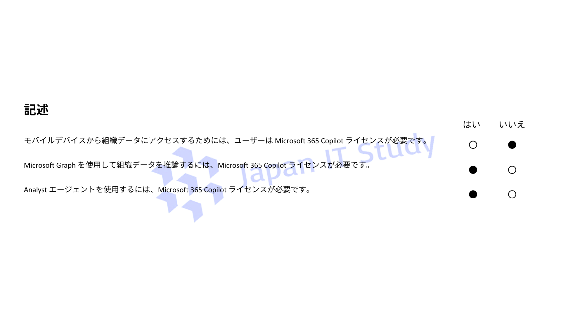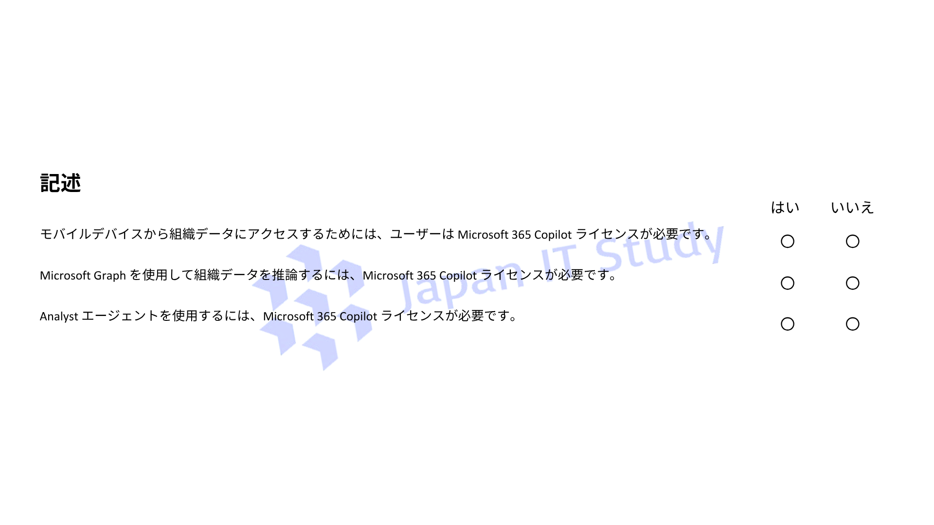 一方で、Microsoft Graphを活用した推論やCopilotの高度な機能(Analystエージェントを含む)は、Microsoft 365 Copilotライセンスによって提供されるためYesが正解です。