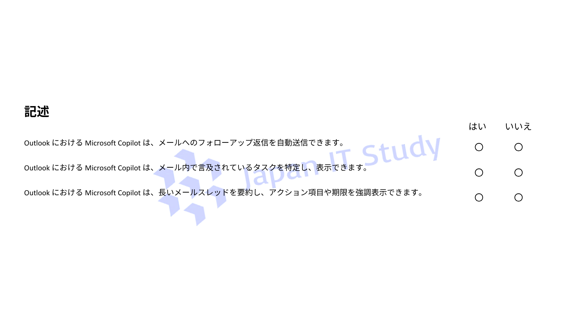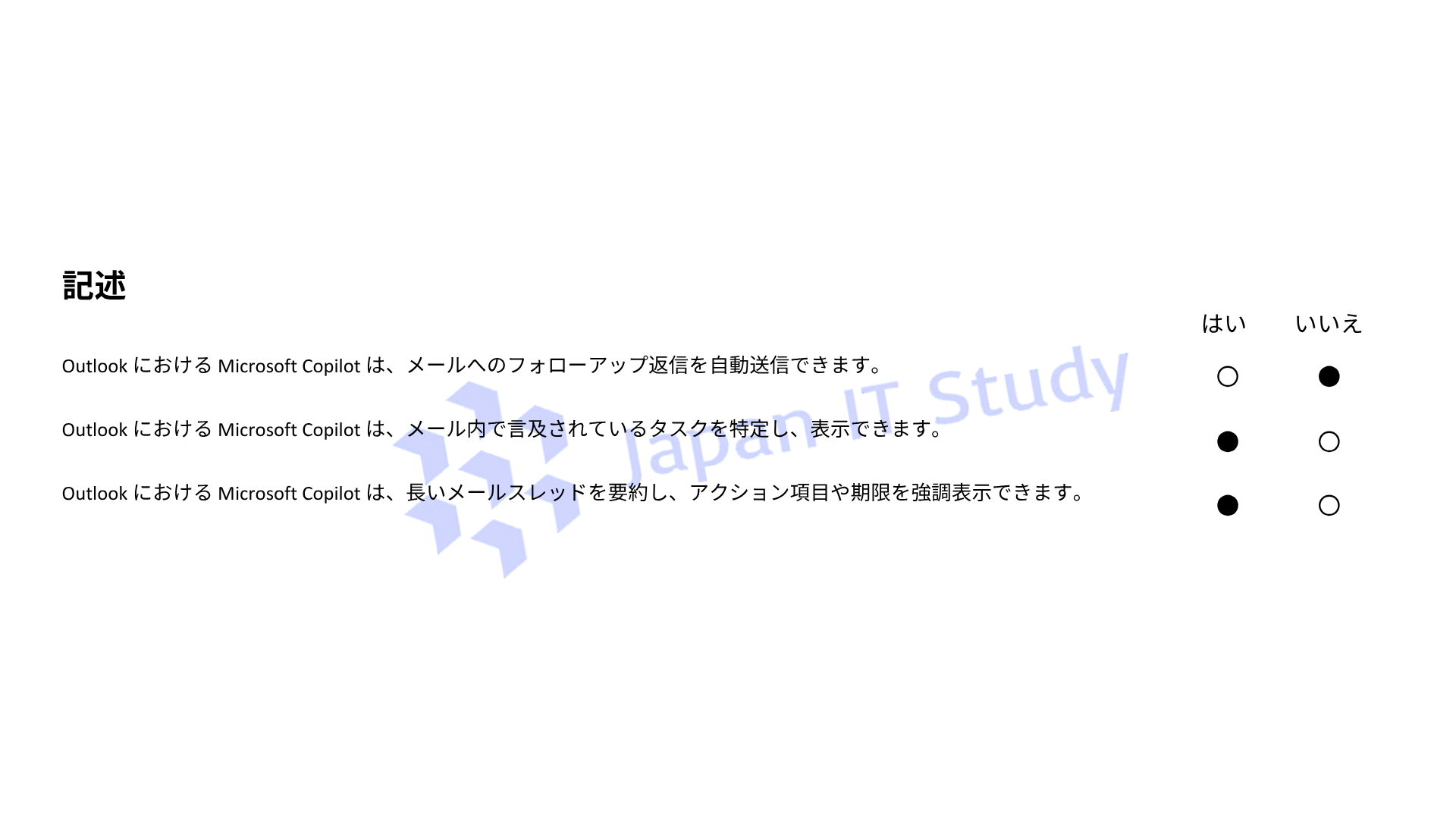 一方で、メール内容の要約や重要事項(タスク・期限)の抽出、アクションの可視化はCopilotの主要機能であり、文脈理解に基づいてユーザーの業務効率を高めるためYesが正解です。 Copilotはユーザー支援を目的とした設計であり、自律的なメール送信のような完全自動処理は想定されていません。
