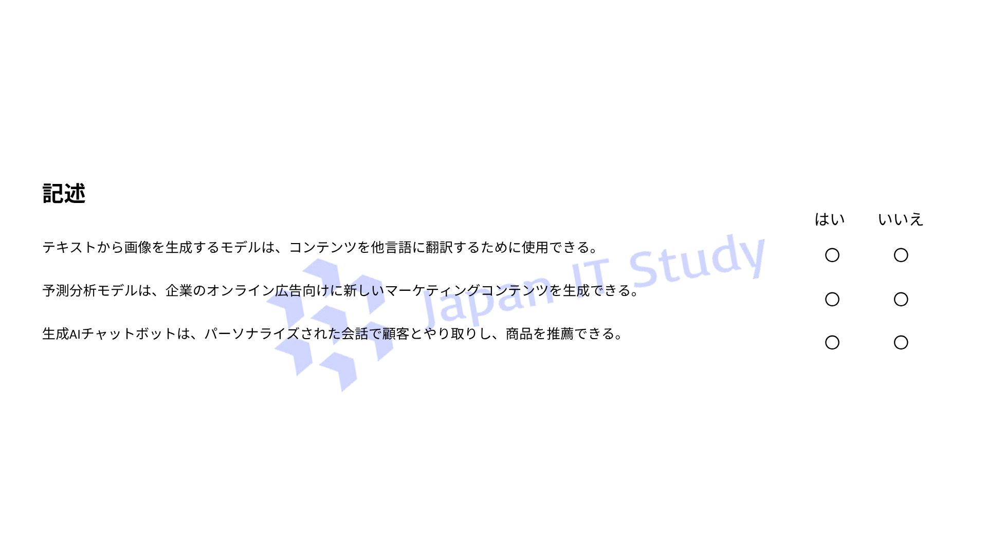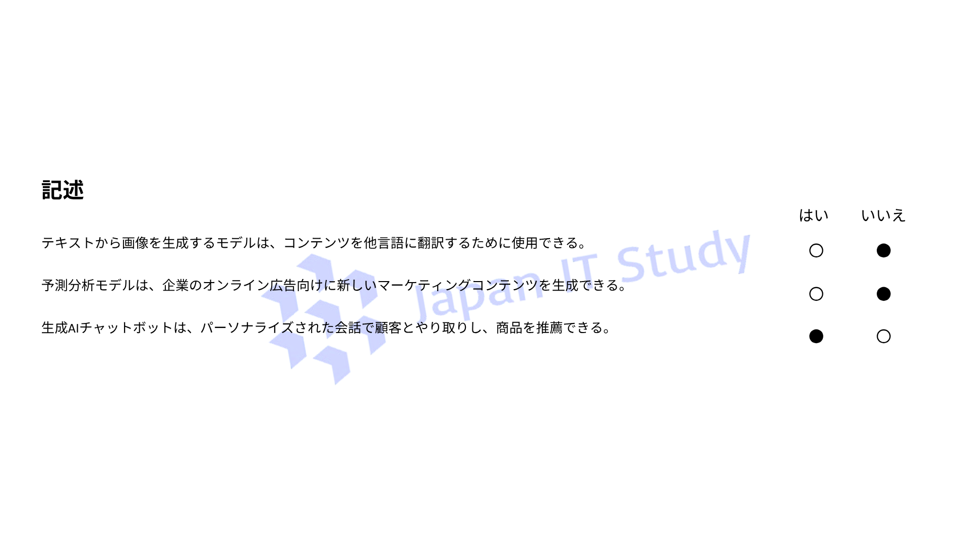 また、予測分析モデルは過去データから将来の傾向を予測するためのものであり、新しいコンテンツ生成は生成AIの役割であるためNoとなります。