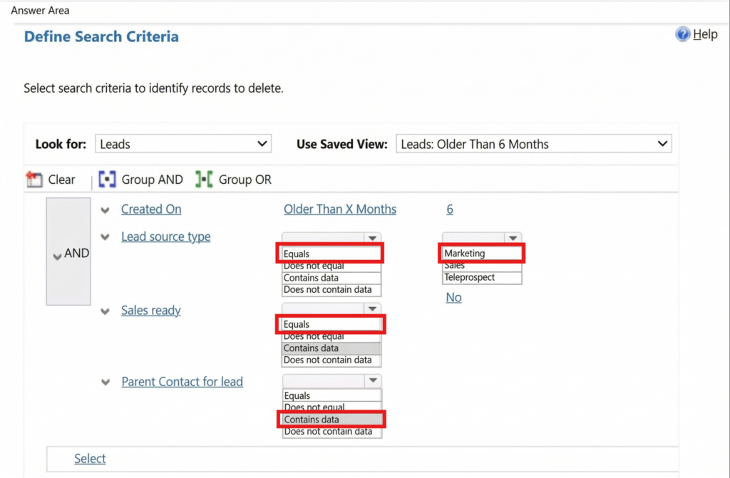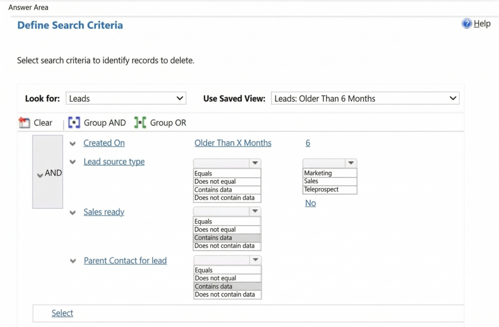 本問では「6か月以上経過」「営業未準備」「親取引先担当者が存在する」リードのみ削除対象です。保存ビューで期間条件は満たされているため、追加条件としてマーケティング起点のリード(Marketing)に限定し、営業準備完了でない(No)ものを指定します。