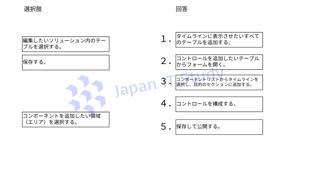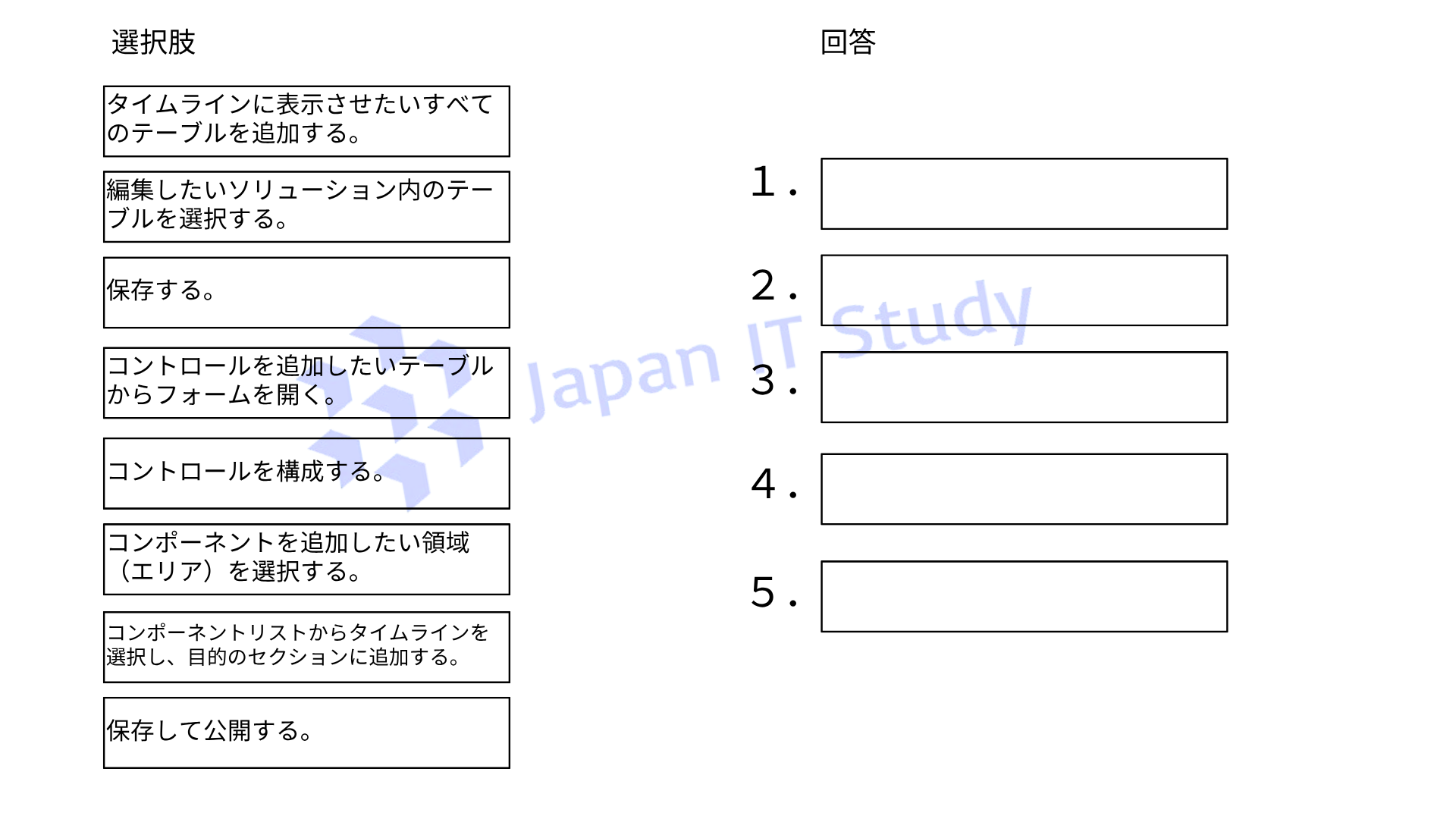 どの5つのアクションを順番に実行する必要がありますか。適切な5つのアクションを正しい順序で並べてください。