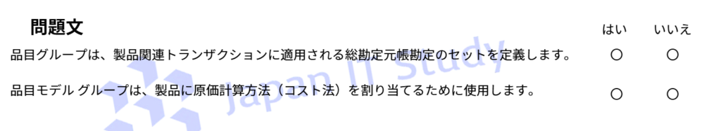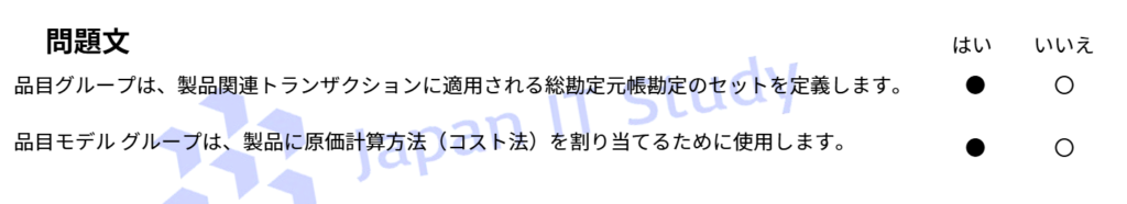 Learn でも「品目グループを定義し、品目グループの台帳勘定を設定する」ことが前提作業として示されていますので、1問目は「はい」が正解です。