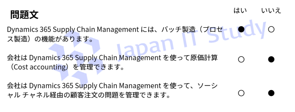Q9.ある企業がDynamics 365 Supply Chain Management を評価しています。次の各ステートメントについて、該当する場合は[はい] を選択します。それ以外の場合は、[いいえ] を選択します。