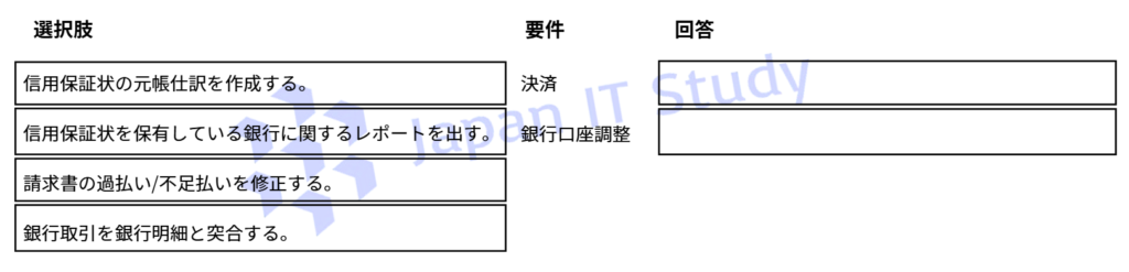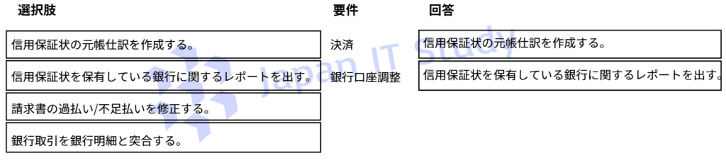 一方、2(銀行が保有する信用保証状のレポート)は、銀行関連情報の照合・確認という目的が強く、銀行明細などと自社記録を突合する銀行口座調整(Bank account reconciliation)側に寄せるのが適切です。