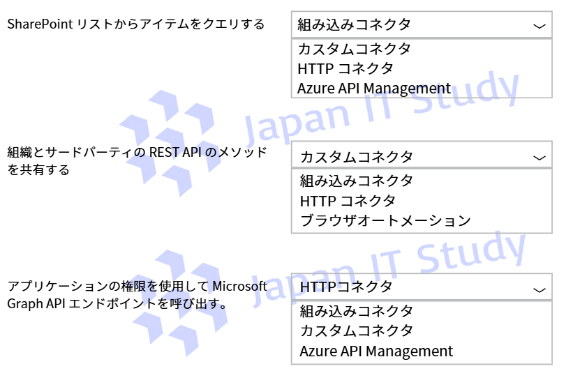 Sharepointとのコネクタは、標準で存在しておりますので1問目は「組み込みコネクタ」が正解です。