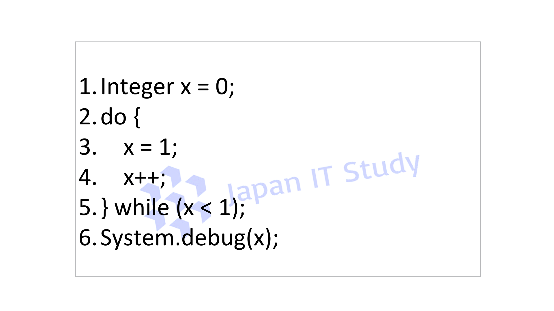その後、while (x < 1) の条件が評価されますが、xはすでに2のため条件はfalseとなりループは終了します。