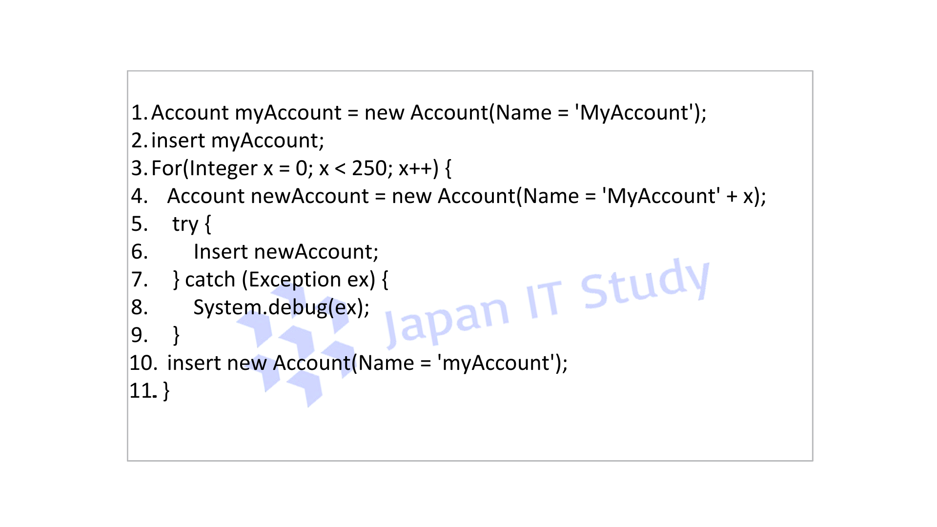 このコードではループ内でinsertが2回実行されますが、1トランザクション内のDML文の上限(150回)を超えると例外が発生します。